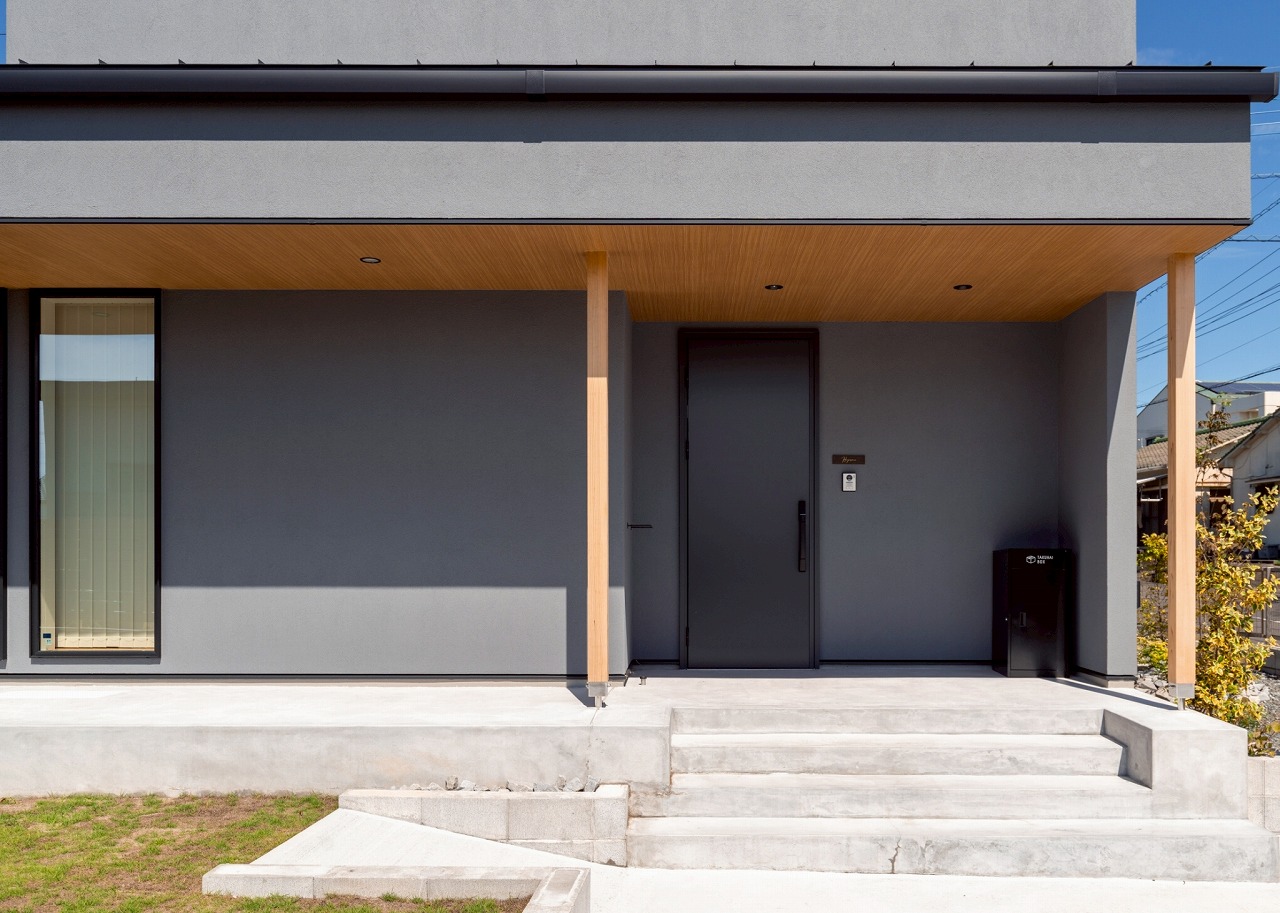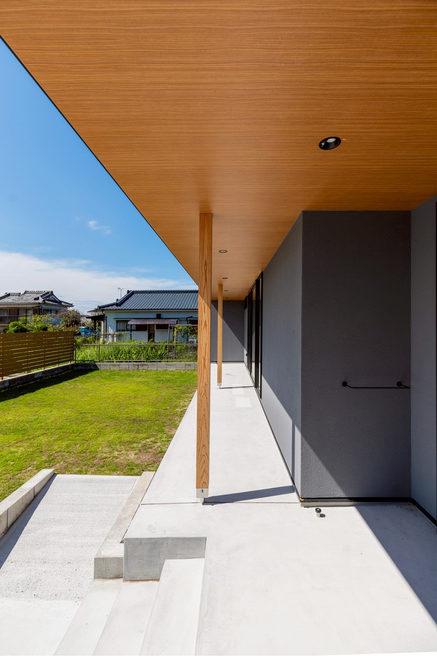 グレーの塗壁に外部の木柱が綺麗に映りました