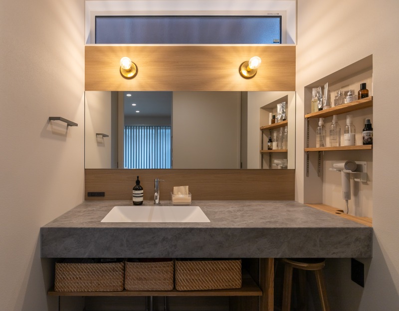 壁面を活かした造作棚を設け、コンパクトながらも多目的に使えるワークスペースを設置しました。