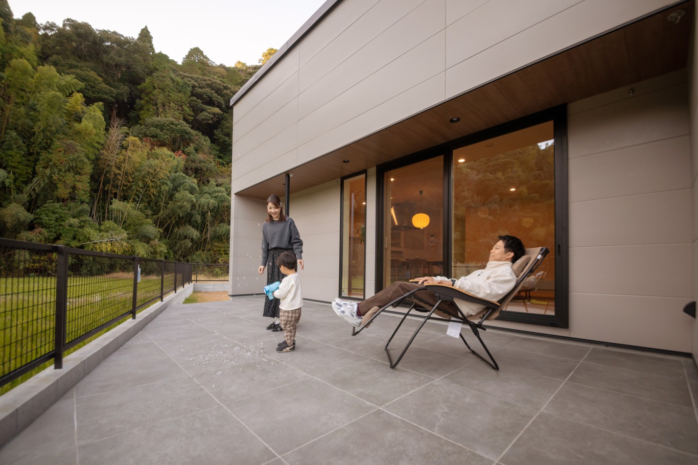 外と内をゆるやかにつなぐテラスでは、家族が思い思いの時間を過ごすひととき。