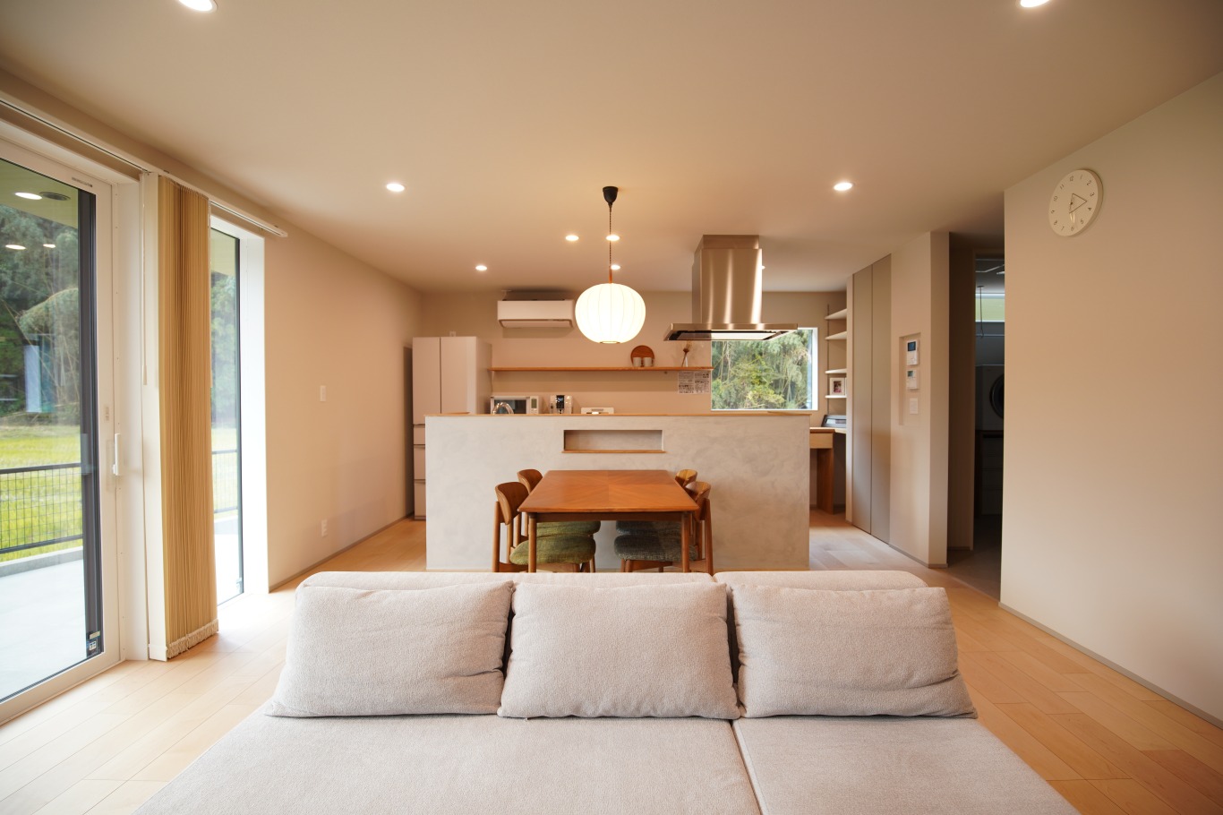 正面の大きな窓からは、季節ごとに表情を変える森の景色がまるで絵を飾るように、暮らしの中に緑を取り込んでいます。
