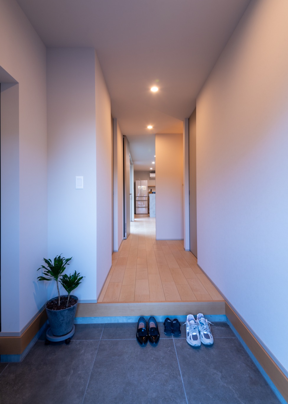 玄関から一直線に伸びる廊下は、平屋ならではの回遊性と使いやすさを確保。